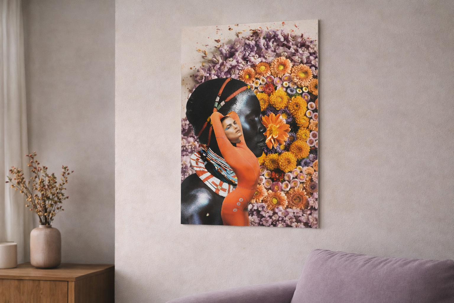Deze collages laten geen vast beeld van vrouw-zijn zien. Ze openen iets dat beweegt, dat zich niet laat vastleggen. Wat je ziet, hangt af van hoe je kijkt.